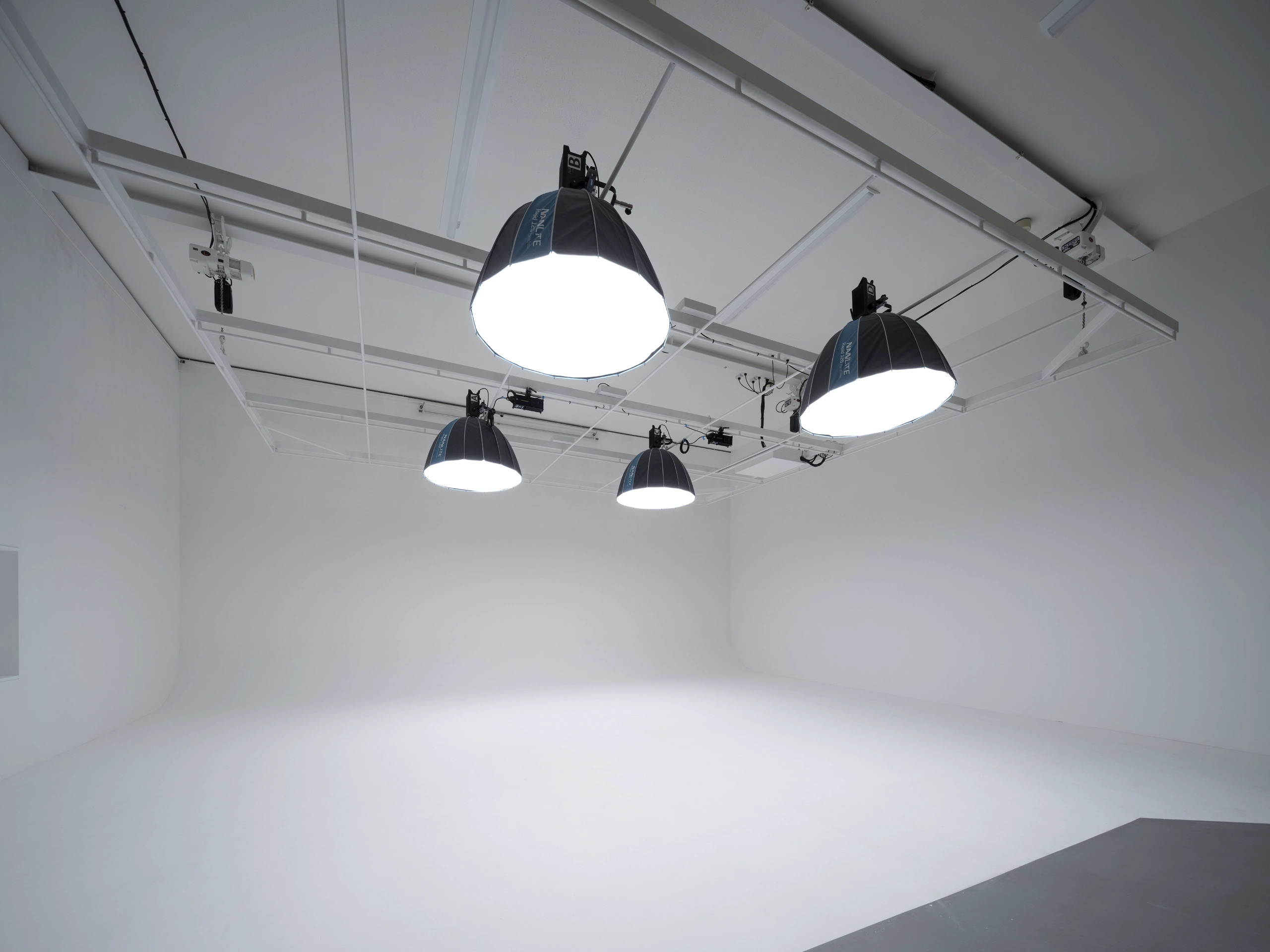 外2基は2m幅の大型電動照明でストロボとタングステンの両方で使用でき、迅速なライティングが可能です。